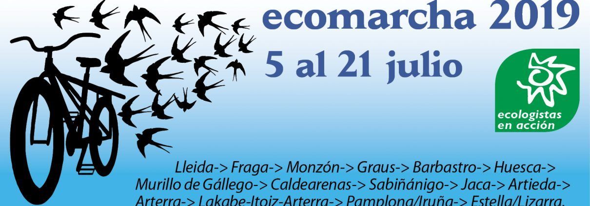 /en Agenda, Rutas, Viajar en BiciLa organización Ecologistas en Acción, decana del activismo medioambiental, convoca una vez más esta modalidad de protesta asociada al cicloturismo viajero o de alforjas. Hace ya nueve años que organizaron la primera Ecomarcha y ya no han parado. Siempre con carácter reivindicativo, cada año centrados en un problema medioambiental, pero creando un contexto de viaje, diversión y camaradería. Este año se trata de reflexionar sobre la ganadería y agricultura industriales, la ruta transcurre de Lleida a Estella-Lizarra (NAVARRA) y su final coincide con la segunda etapa de los encuentros de Conbici 2019 (Navarra). En recorrido en el que se tomará conciencia y, a la vez, se denunciarán varios problemas relacionados con la idea de que el campo es una fábrica: macrogranjas, regadíos abusivos, vertidos, embalses, contaminación de aguas y despoblación del mundo rural.
