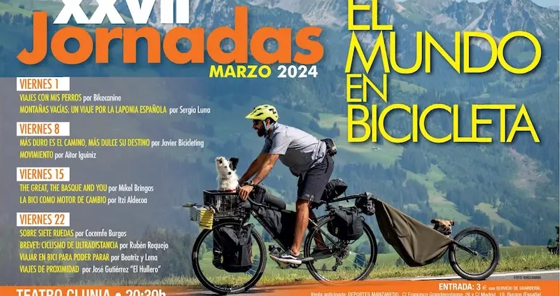 /en Jornadas El Mundo en Bicicleta, Viajar en BiciTodos los viernes de marzo tienes una cita con el mundo del cicloviaje. Se trata de las Jornadas «El mundo en bicicleta». Este año se consolida el formato de varias mini-charlas por día y los viajes más cortos. Y eso hace la oferta tremendamente variada. Este año, además, entra de lleno el Bikepacking como modalidad viajera en alza.