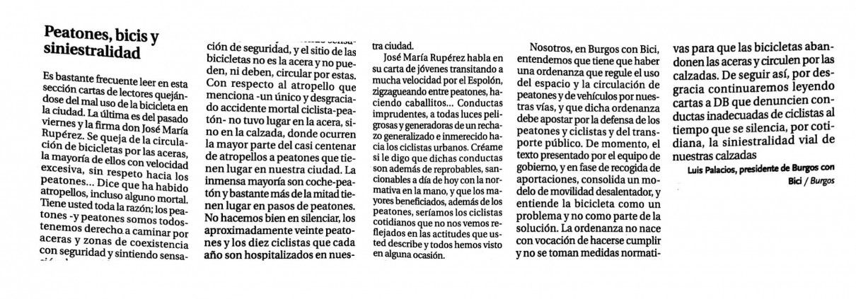 Nosotros, en Burgos Con Bici, entendemos que tiene que haber una Ordenanza que regule el uso del espacio y la circulación de peatones y de vehículos por nuestras vías, y que dicha ordenanza debe apostar por la defensa de los peatones y ciclistas y del transporte público. De momento, el texto presentado por el equipo de gobierno, y en fase de recogida de aportaciones, consolida un modelo de movilidad desalentador, y entiende la bicicleta como un problema y no como parte de la solución. La ordenanza no nace con vocación de hacerse cumplir y no se toman medidas normativas para que las bicicletas abandonen las aceras y circulen por las calzadas. De seguir así, por desgracia continuaremos leyendo cartas a DB que denuncien conductas inadecuadas de ciclistas al tiempo que se silencia, por cotidiana, la siniestralidad vial de nuestras calzadas