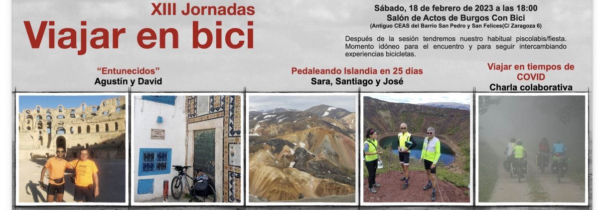 /en Jornadas Viajar en BiciEl próximo 18 de febrero de 2023, sábado, celebraremos las XIII Jornadas «Viajar en bici». Como sabéis, se trata de charlas caseras en las que intercambiamos nuestras experiencias, consejos, trucos y recomendaciones de todo tipo, sobre viajes en bici. Este año, dos viajes en bici (Túnez e Islandia) y un coloquio sobre cómo vivimos nuestras escapadas en estos tiempos de pandemia.